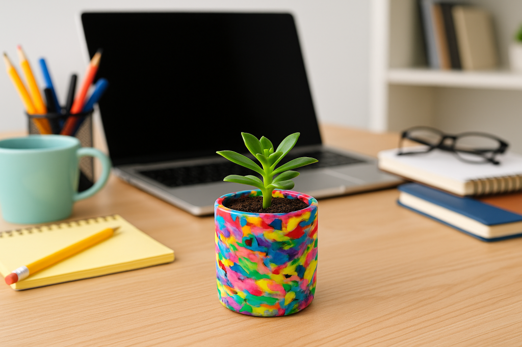 Maak kennis met de Desk Bloom. De Desk Bloom-plantenpot is volledig gemaakt van gerecyclede plastic flesdoppen. Elke pot wordt met de hand gesmolten, gevormd en afgewerkt, waardoor er telkens een uniek en kleurrijk ontwerp ontstaat.
