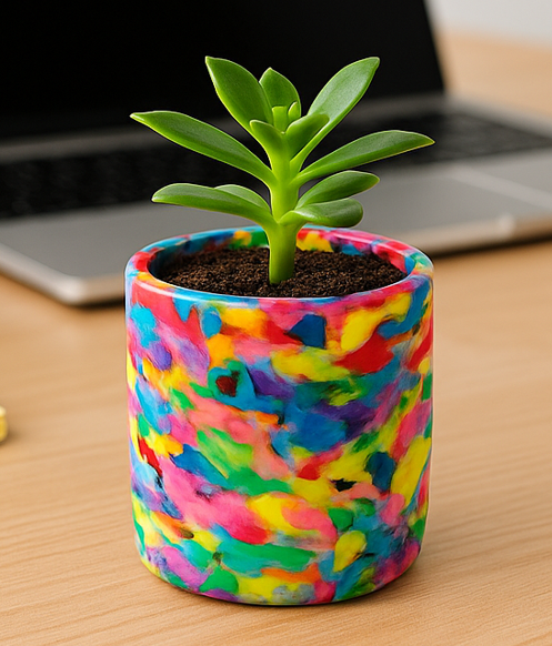 Elke Desk Bloom wordt met de hand gemaakt van gerecyclede plastic flesdoppen. Door de originele kleuren van het plastic te behouden, is elke pot uniek. De pot is licht van gewicht, waterbestendig, duurzaam en geschikt voor zowel binnen- als buitengebruik